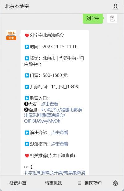 刘宇宁巡演抢票 11月5日开抢!刘宇宁2025演唱会北京站将于2025年11月15日至16日在北京华熙生物·润百颜中心场馆举办。抢票时间为11月5日13:08。