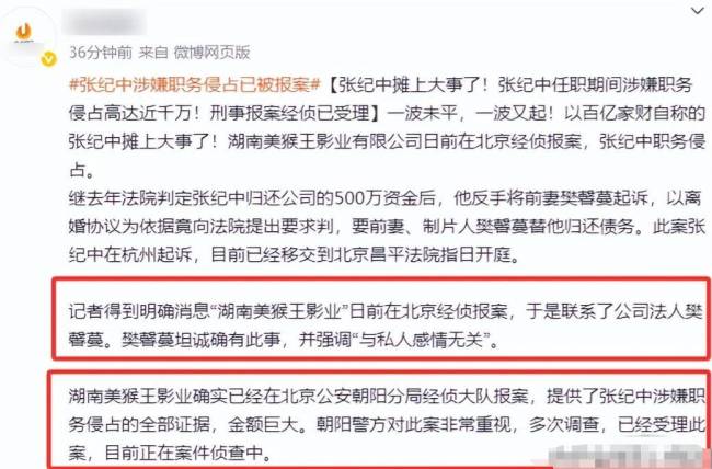 11月5日,媒体爆出张纪中又摊上大事了,这次涉及刑事问题。这起案件其实是个旧案,牵扯到他和前妻樊馨蔓在湖南美猴王影业有限公司的时期。当时张纪中是总经理,樊馨蔓是法人。据说2023年在山西报案未果,现在公司直接跑到北京报案,控诉理由是“职务侵占”。