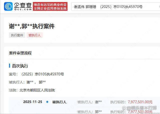 2025年11月25日,谢孟伟与妻子郭珊珊被北京市朝阳区人民法院列为被执行人,执行标的约797.75万元。此次执行叠加此前多起案件,两人累计被执行金额已超过2100万元。其中包括河南濮阳法院执行524万元、郑州法院执行171万元(均涉及民间借贷纠纷)、湖南新邵县法院执行210万元以及北京大兴区法院恢复执行500万元。由于未履行还款义务,自2025年10月起,两人被多地法院限制高消费。