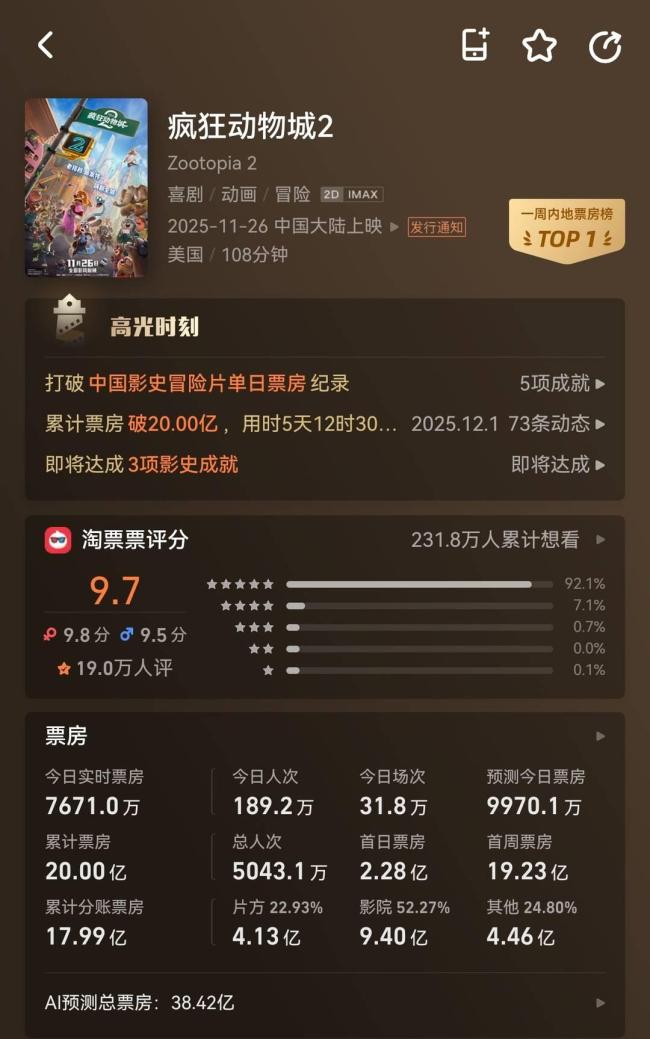 《疯狂动物城2》票房破20亿 创进口片年内新高
