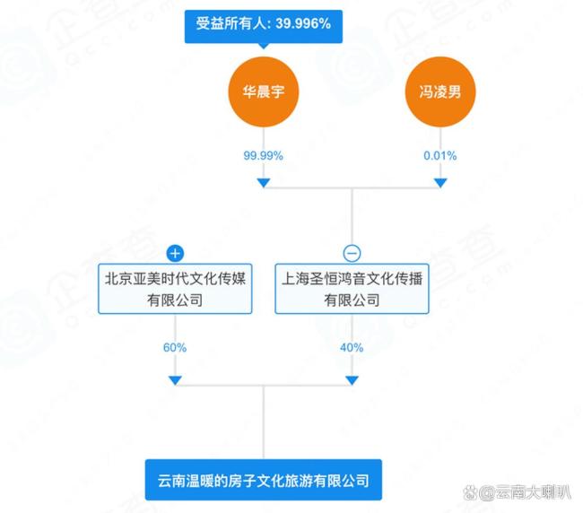 事实证明,这家公司确实与华晨宇有联系。据企业查询平台显示,云南温暖的房子文化旅游有限公司由华晨宇持股99%的上海圣恒鸿音文化传播有限公司和“火星演唱会”主办方北京亚美时代文化传媒有限公司共同持股。虽然上海圣恒鸿音并非最大股东,但华晨宇无疑是这家新公司的背后老板之一。