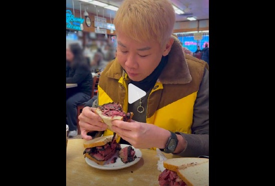 陶喆于12月3日通过微博晒出在纽约百年老店 Katz’s Deli 享用的招牌烟熏牛肉三明治(Pastrami Sandwich),配文调侃"感觉塞了将近一斤牛肉",并附上大口咬下的满足表情。照片中牛肉层厚度远超面包片,肉汁浸润面包的视觉冲击力引发热议,被粉丝戏称为"肉立方"。