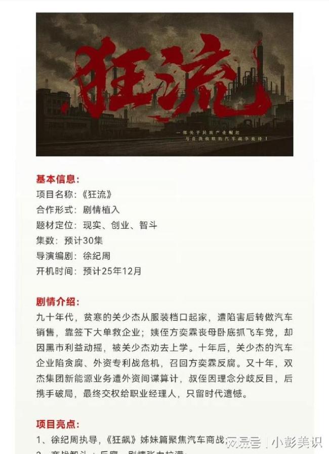 导演徐纪周执导的这部剧聚焦于汽车商战。剧情讲述了贫寒出身的关少杰从服装档口起家,因遭陷害转做汽车销售,并通过签下大单挽救企业,还资助姨侄方奕霖上学。十年后,关少杰的企业陷入贪腐风波,召回方奕霖进行反腐。再过十年,双杰集团的新能源业务受到外资间谍的算计,叔侄二人因理念分歧反目成仇,最终携手破局,将企业管理权交给了职业经理人。从简介来看,故事张力十足,年代跨度大,高潮迭起。